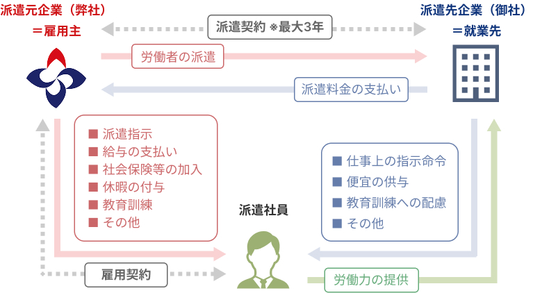 派遣労働とは、派遣元企業(弊社)が雇用する労働者を、派遣先企業の指揮命令を受けて、この派遣先企業のために労働に従事させることです。